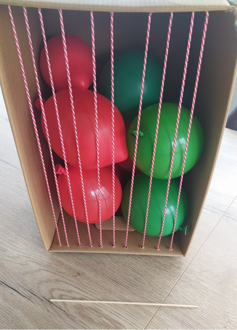 - Prenez un carton (assez grand pour y mettre tous les ballons) découpez un carré sur un des côtés. Et attaché des bouts de ficelle pour faire les barreaux d'une prison et que ce soit assez souple. Vous pouvez les coller avec un pistolet à colle ou faire des petits trous insérer la corde et faire un nœud. Si vous préférez vous pouvez faire les barreaux en carton mais veillez à ce que l'écartement des cartons soit assez gros/large pour y insérer la main de votre enfant. Si ça ne va pas, pensé à prendre une pince ou une éprouvette.