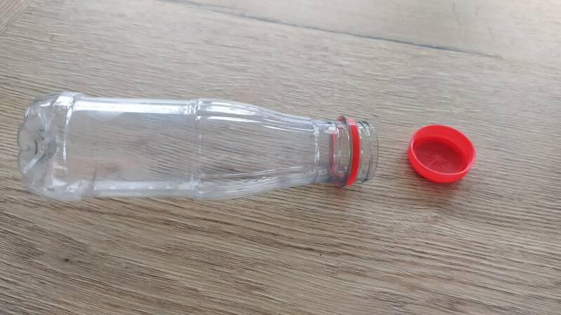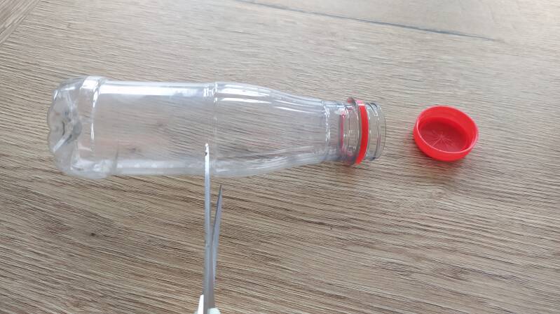Découpez votre bouteille avec votre paire de ciseaux. Aidez-vous de la démarcation