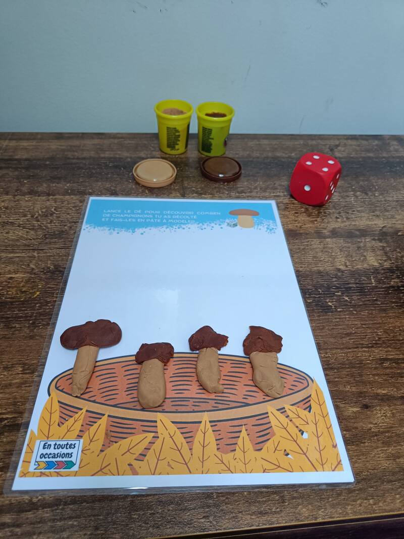 Votre enfant pourra faire un peu de mathématique avec ce tapis. Pour cela, il va devoir lancer le dé et réaliser autant de champignons qu'indiqué par le dé et les placer dans son panier.