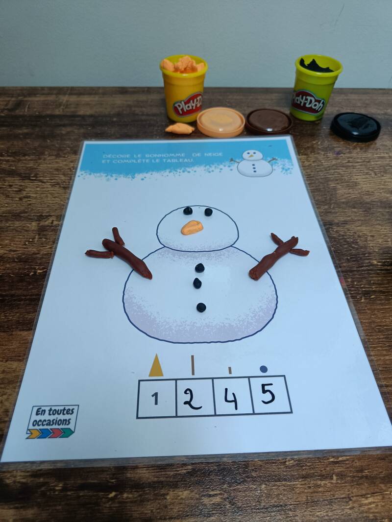Ce modèle permet à l'enfant de travailler les formes avec le bonhomme de neige à compléter mais également à compter jusqu'à 5.