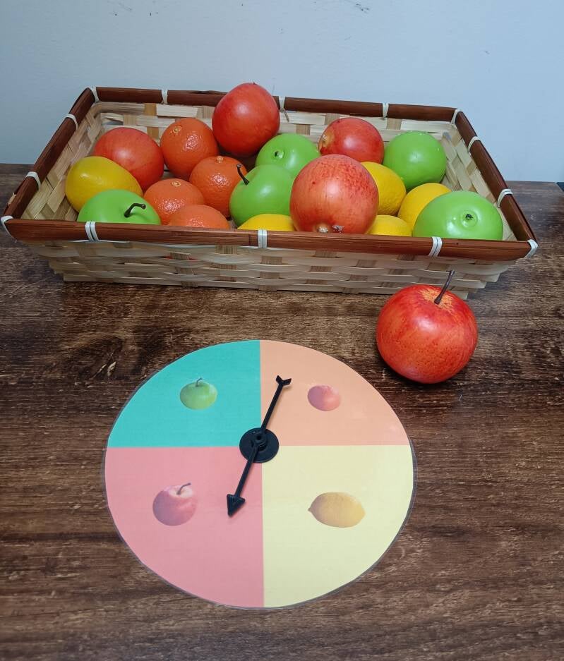 - Les joueurs vont tourner la roue chacun l'autre tour : récupérer le fruit associé à la roue et le donner à la personne qui a choisi ce fruit.
