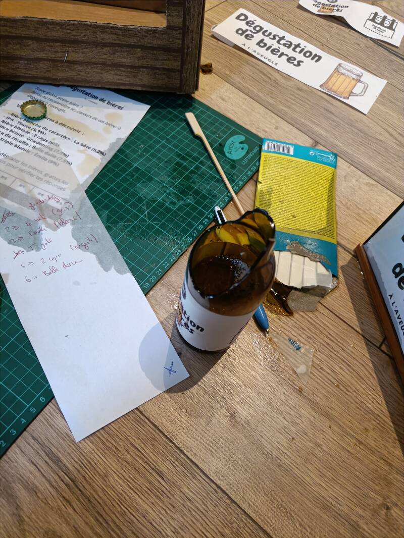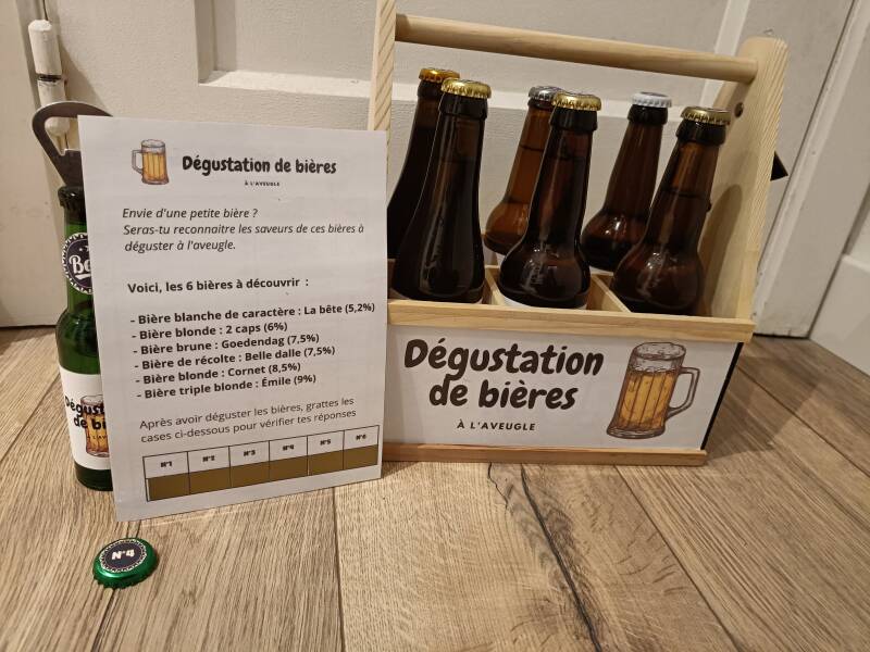 À la base, je voulais lui acheter des bières qu'il connaissait pour savoir s'il allait reconnaître ces bières mais les bières avaient un design qu'il aurait forcément reconnu donc j'ai changé légèrement mon idée avec toujours une dégustation à l'aveugle mais dont je lui donnerais le nom avec le pourcentage d'alcool et les caractéristiques de la bière : blonde, blanche, brune, triple ... Afin de voir si il arriverait à faire la différence avec ces informations là.
