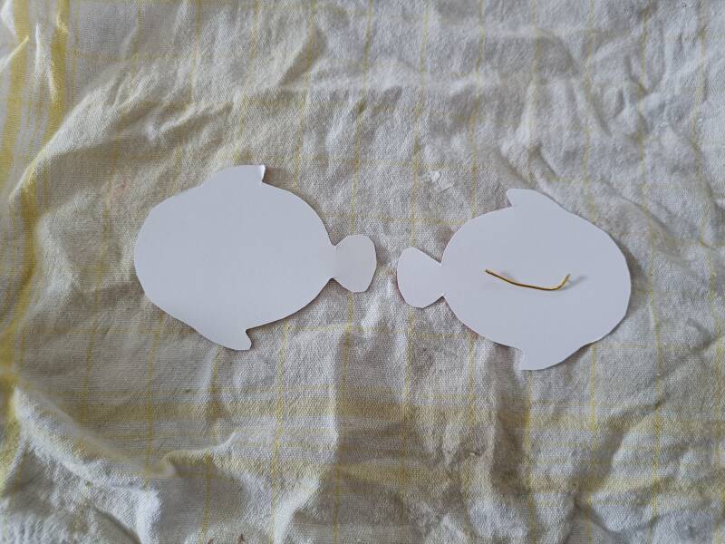 J'avais donc imprimé des poissons (en effet miroir), à l'intérieur j'avais mis : du fil de fer doré, des pièces, des diamants ...