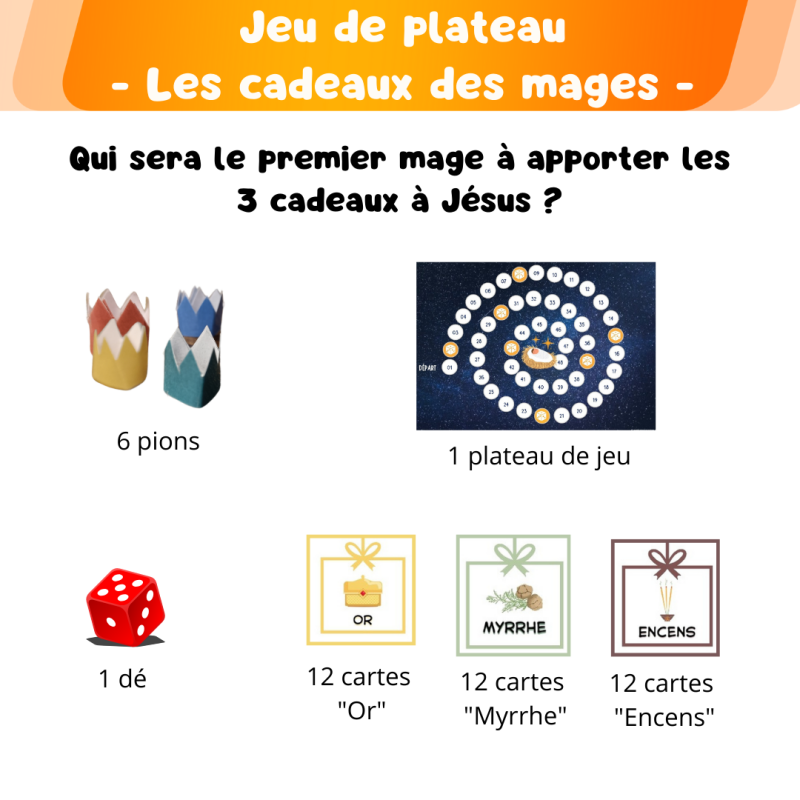 Vous êtes des mages, votre but est d'être le premier à arriver à Jésus mais en ayant en votre possession les 3 cadeaux (or, myrrhe, encens).