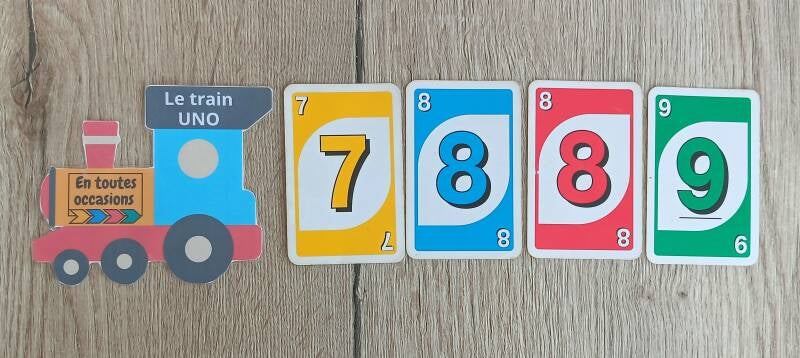 Niveau facile donnez à l'enfant exactement le même nombre de cartes que ceux qui composent le train. Donc les mêmes cartes que les wagons et 2 autres.