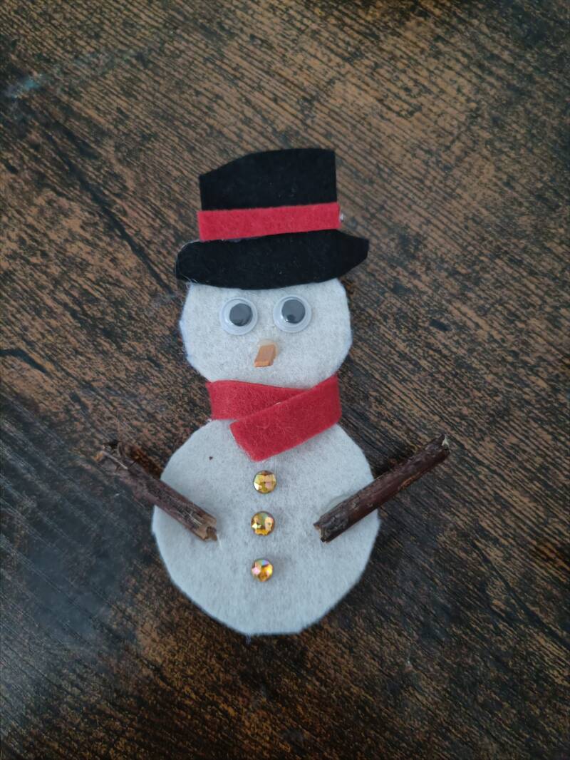 9. Il ne vous reste plus qu'à prendre votre bout de bâton et coupez deux morceaux de même taille pour réaliser les bras du bonhomme de neige. Il vous suffit tout simplement de les coller (j'ai utilisé un pistolet à colle mais vous pouvez également les fixer avec le collant double face)