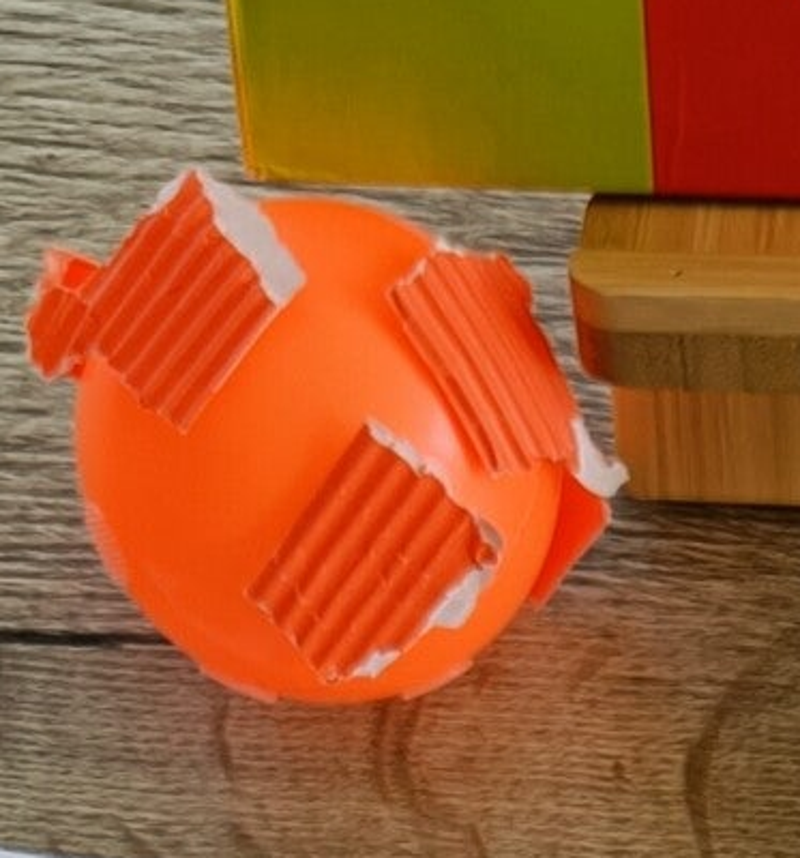 J'ai mis des scratches sur le papier que je suis venue positionner sur une balle de piscine à balles orange afin de représenter l'orange à éplucher.