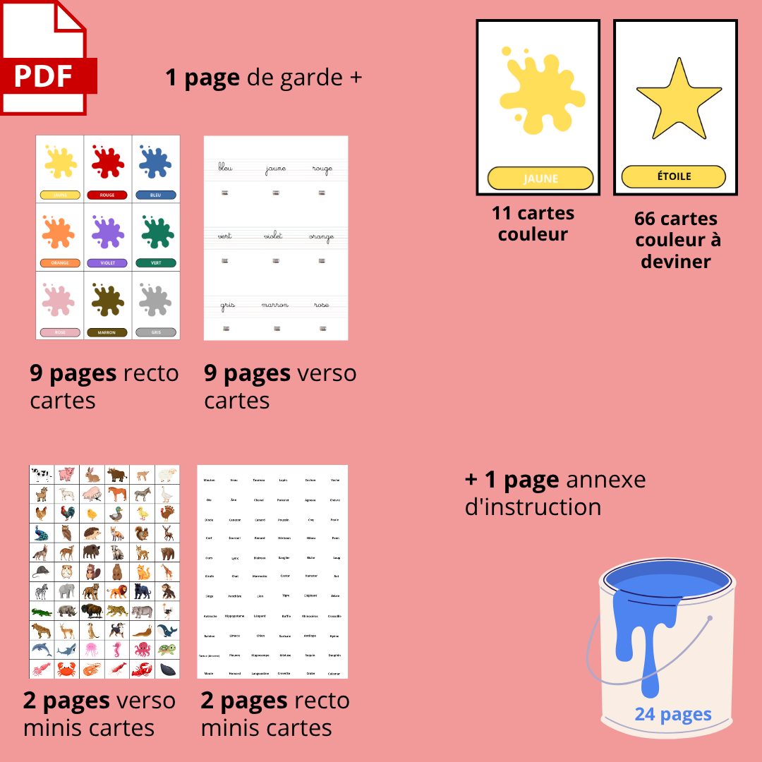 - 66 cartes de cartes à deviner recto / verso (une face avec la couleur, l'autre sans)