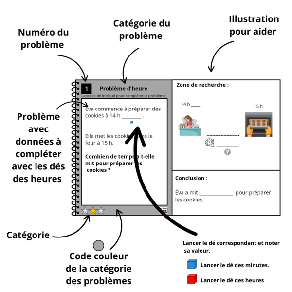 Les problèmes sont réalisés de façon ludique, l'enfant doit lancer le dé des heures pour compléter les données du problème avant de le résoudre.