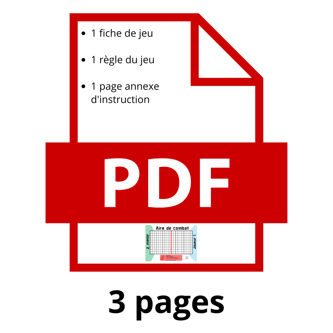 Ce PDF vous permet d'obtenir le jeu "Aire de combat". Vous allez avoir besoin de deux dés pour utiliser ce document. La notice est disponible sur le PDF, vous pouvez également consulter la vidéo de présentation sur la fiche de l'article.