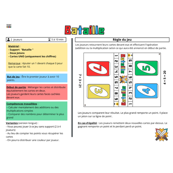 Ce PDF vous permet d'obtenir le jeu "Bataille. Vous allez avoir besoin d'un jeu de cartes UNO pour utiliser ce document. La notice est disponible sur le PDF, vous pouvez également consulter la vidéo de présentation sur la fiche de l'article.