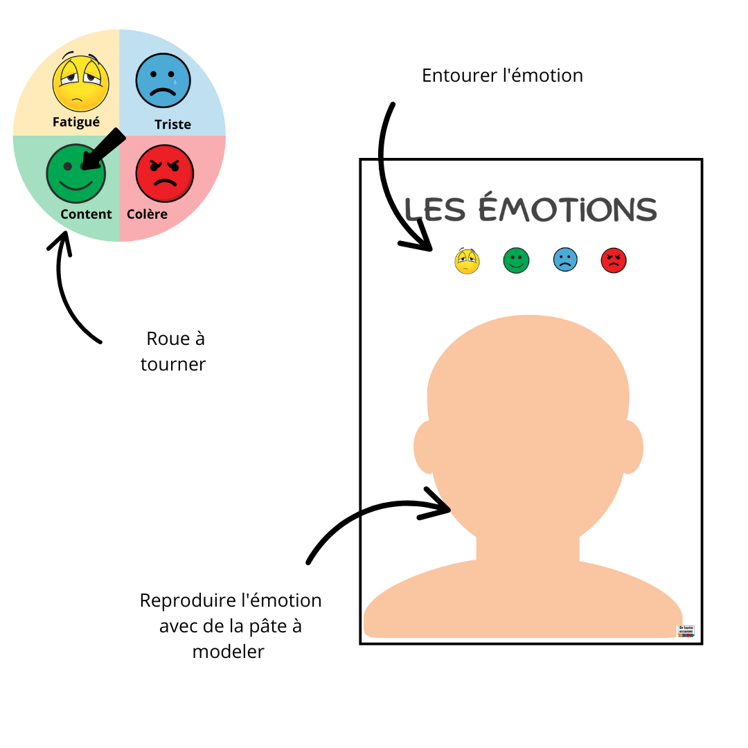 - une roue des émotions (fatigue, tristesse, joie et colère)
